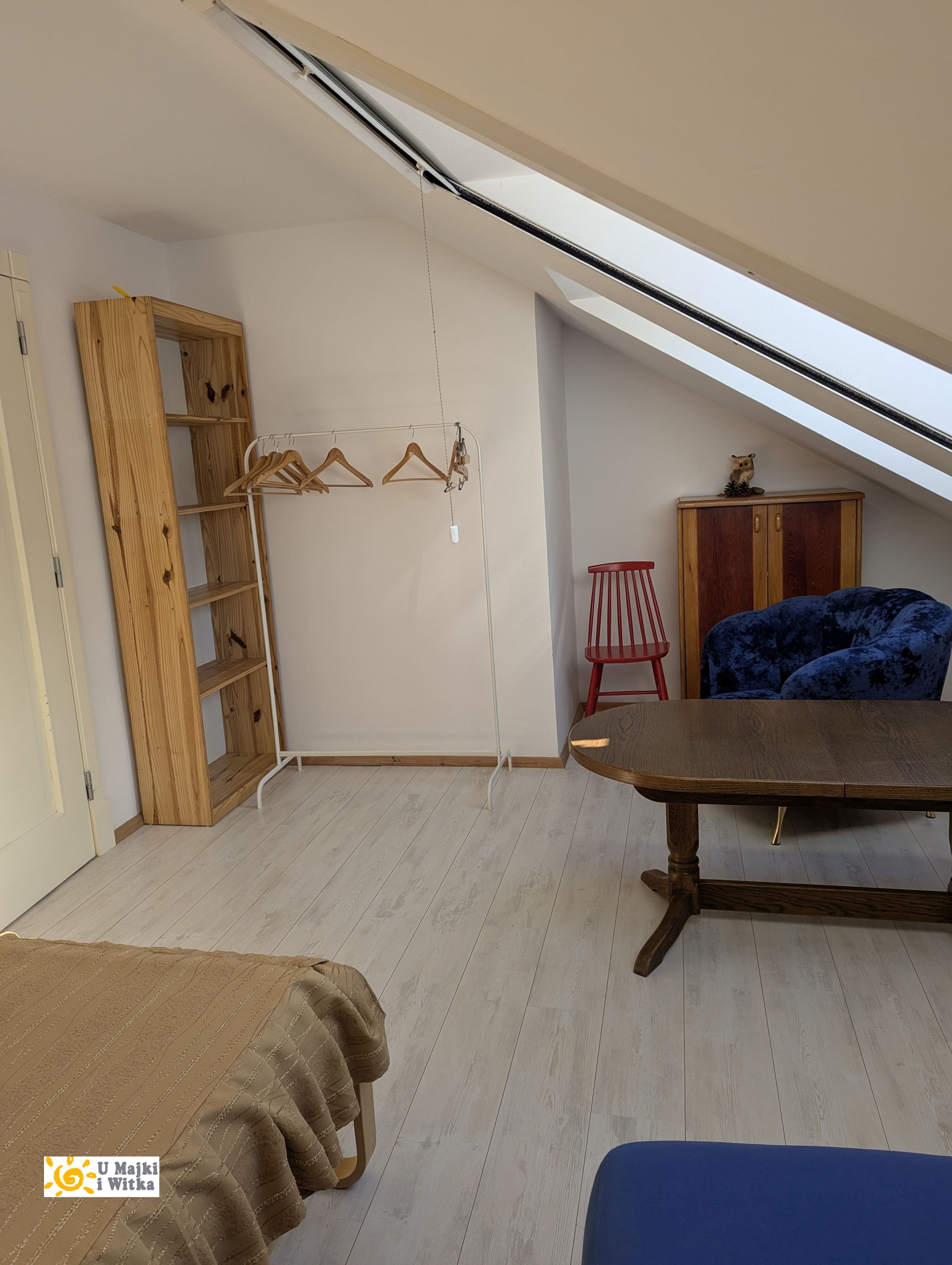 Z dużego pokoju jest także przejście do małego pokoju, który można nazwać sypialnią. Tu jedno duże łóżko dwuosobowe i rozkładany młodzieżowy tapczanik, także wygodny fotel wypoczynkowy, stół rozkładany, szafka, regał i stojak na wieszaki ubraniowe.