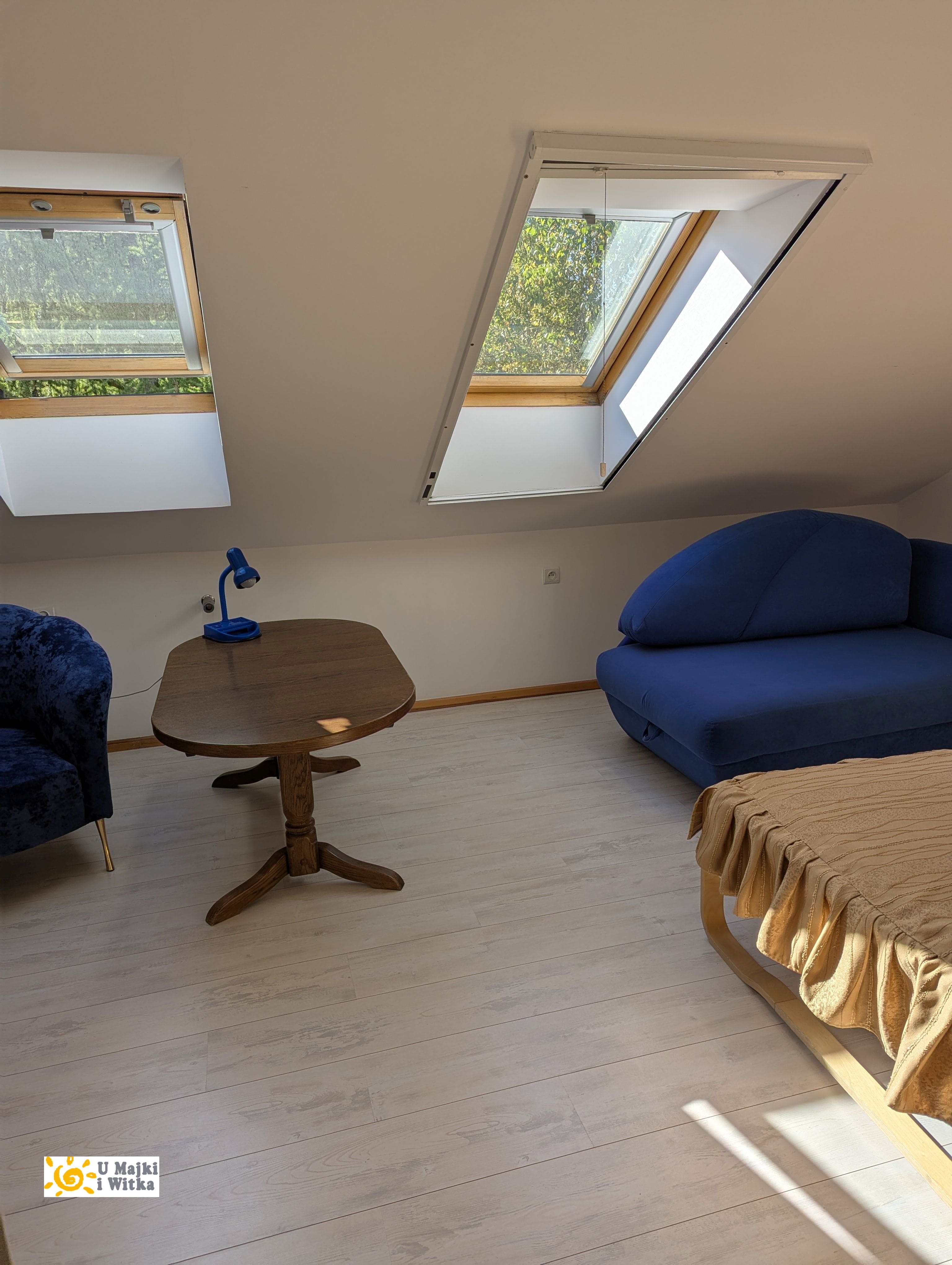 W dużym pokoju stoi wygodna duża narożna kanapa i wersalka (rozkładane do spania dla 3-4 osób), 2 fotele, stół, szafki, stojak na wieszaki ubraniowe, telewizor. Można korzystać z TV naziemnej lub przez Internet korzystając z naszego radiowego łącza (dla gości bezpłatnie). W wygodnych fotelach można posiedzieć wieczorem i obejrzeć dobry film lub przy stole zagrać w planszówki. Dodatkowo przy ścianie wejściowej ustawiliśmy złożony stół do ping ponga. Przygotowaliśmy także siatkę i rakietki. Można zagrać dobry mecz w deszczowy dzień rozkładając stół na środku pokoju. Mamy tylko prośbę aby stół rozkładać bardzo ostrożnie. W tym pomieszczeniu znajduje się druga jednostka klimatyzacji z funkcją chłodzenia lub grzania. Z tego pokoju wyjście na schody, do oddzielnego WC z umywalką i mniejszego pokoju - sypialni. Dla dzieci mamy także łóżeczko bez pościeli i rozkładane krzesełko do karmienia.