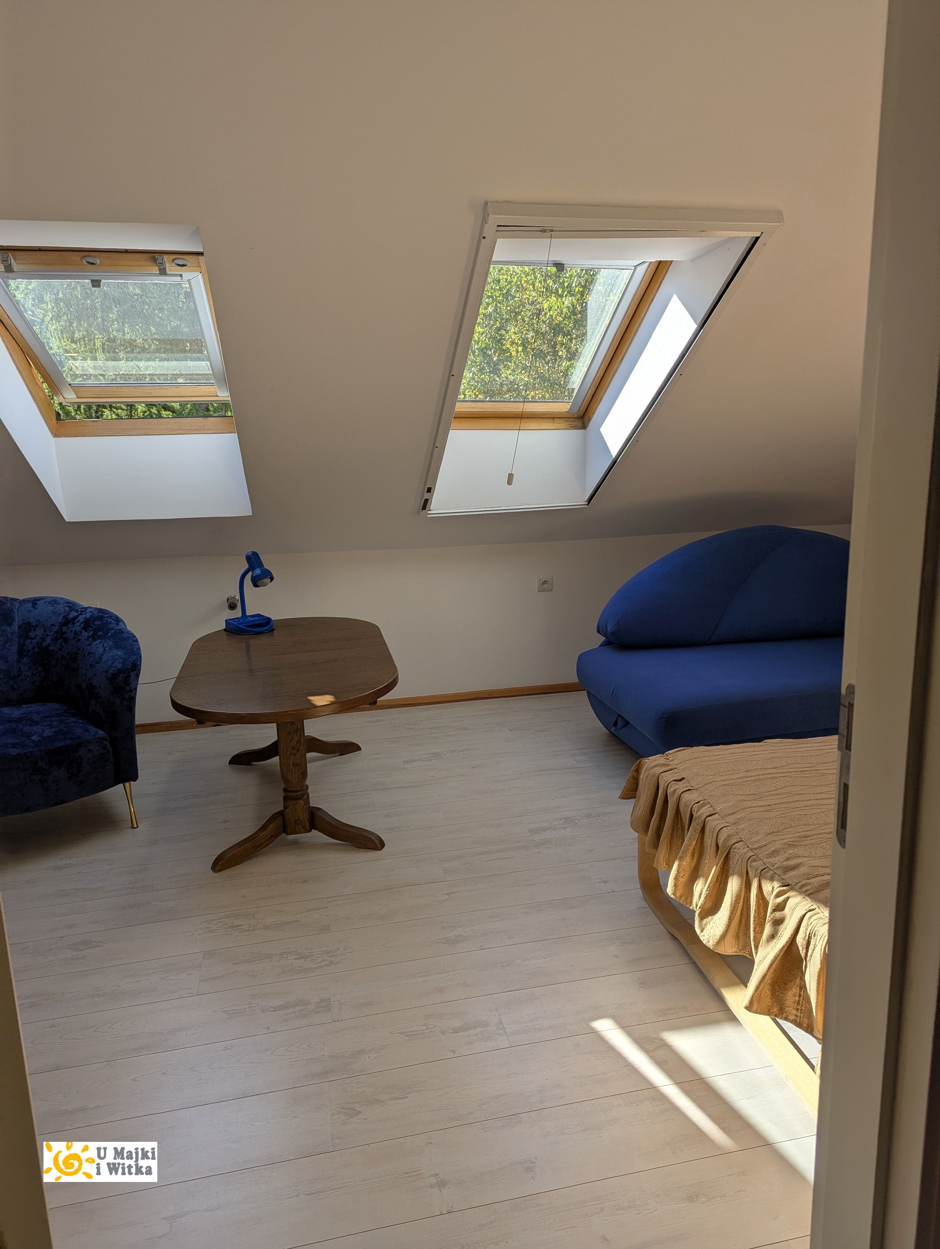 W dużym pokoju stoi wygodna duża narożna kanapa i wersalka (rozkładane do spania dla 3-4 osób), 2 fotele, stół, szafki, stojak na wieszaki ubraniowe, telewizor. Można korzystać z TV naziemnej lub przez Internet korzystając z naszego radiowego łącza (dla gości bezpłatnie). W wygodnych fotelach można posiedzieć wieczorem i obejrzeć dobry film lub przy stole zagrać w planszówki. Dodatkowo przy ścianie wejściowej ustawiliśmy złożony stół do ping ponga. Przygotowaliśmy także siatkę i rakietki. Można zagrać dobry mecz w deszczowy dzień rozkładając stół na środku pokoju. Mamy tylko prośbę aby stół rozkładać bardzo ostrożnie. W tym pomieszczeniu znajduje się druga jednostka klimatyzacji z funkcją chłodzenia lub grzania. Z tego pokoju wyjście na schody, do oddzielnego WC z umywalką i mniejszego pokoju - sypialni. Dla dzieci mamy także łóżeczko bez pościeli i rozkładane krzesełko do karmienia.